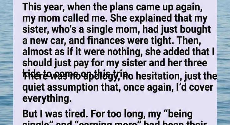 Every summer, my family planned a vacation—sunshine, laughter, and group photos. But behind the scenes, I was always footing the bill. My siblings brought spouses and kids, yet I, single …