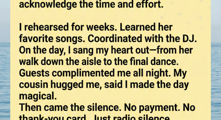 When my cousin asked me to sing at her wedding, I was honored. She said she wanted live vocals for the ceremony, cocktail hour, and reception—and promised to pay me …