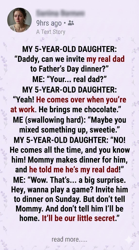 Last week, picking Lily up from preschool felt completely normal. She was in the back seat, smelling of finger paint. Everything changed as we pulled into the driveway. She leaned forward from her booster seat, crayon still in hand, and uttered the words that instantly froze my blood. “Daddy, can we please invite my real dad to Father’s Day dinner?” I managed to choke out, “Your… real dad?” trying desperately to sound calm. She nodded immediately, her curls bouncing. “Yeah! He comes over all the time when you’re at work. He brings me nice chocolates. Mommy makes dinner for him, and you know him. He told me he’s my real daddy.”