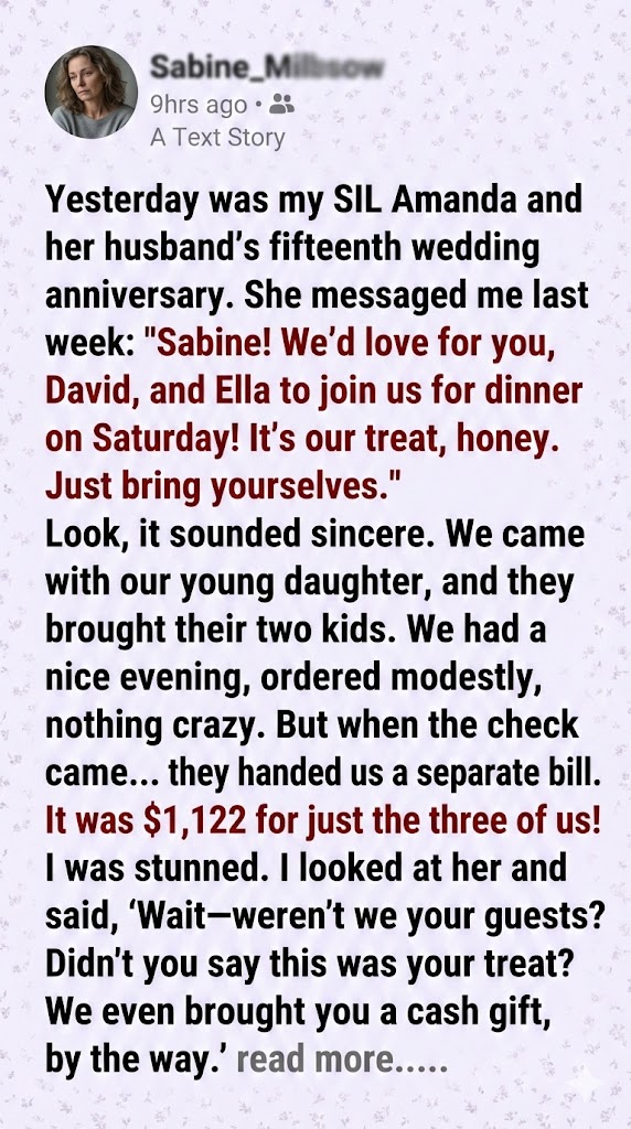 Sabine thought she was walking into a celebration of love. Her sister-in-law Amanda had invited her, her husband David, and their daughter Ella to a lavish downtown restaurant for Amanda and Jeff’s 15th anniversary. “It’s our treat, honey,” Amanda had promised. Sabine even brought a heartfelt card with $200 tucked inside—a gesture of goodwill and respect.