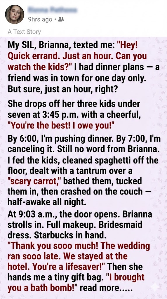 When my sister-in-law asked me to watch her kids for “just an hour,” I cancelled dinner plans with a friend. She only showed up the next morning in a bridesmaid dress like nothing happened. I realized kindness without limits taught entitled people the wrong things… so I showed her something else.