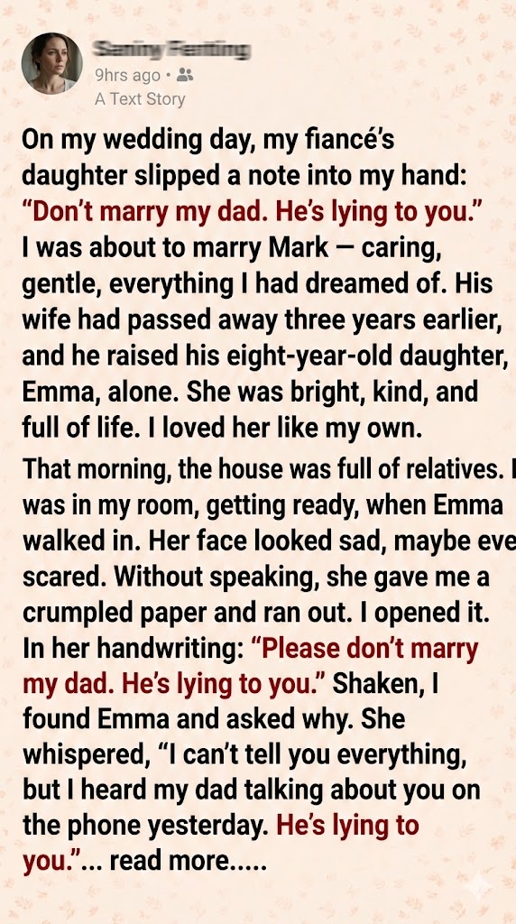 I unfolded the note slowly. In her careful, childlike handwriting, it said: “Don’t marry my dad. He’s lying to you.”