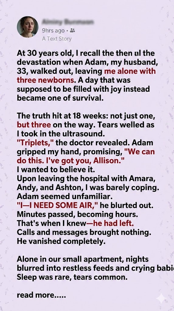 I was only 23 years old when Adam walked out of our lives, and even now, at 35, I can still hear the crushing silence he left in his wake. There was no final conversation, no closure, and certainly no apology. There was only the clinical sound of the hospital door clicking shut while I sat there, stitched and trembling, taking turns holding our newborn triplets. I was stunned, physically wrecked, and entirely alone.