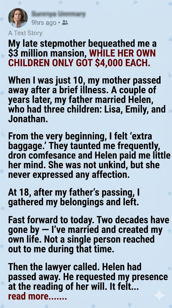 I grew up invisible in my own home — an afterthought in my father’s second marriage. So when my stepmother passed away years later, no one was more shocked than I was to learn what she had left me.