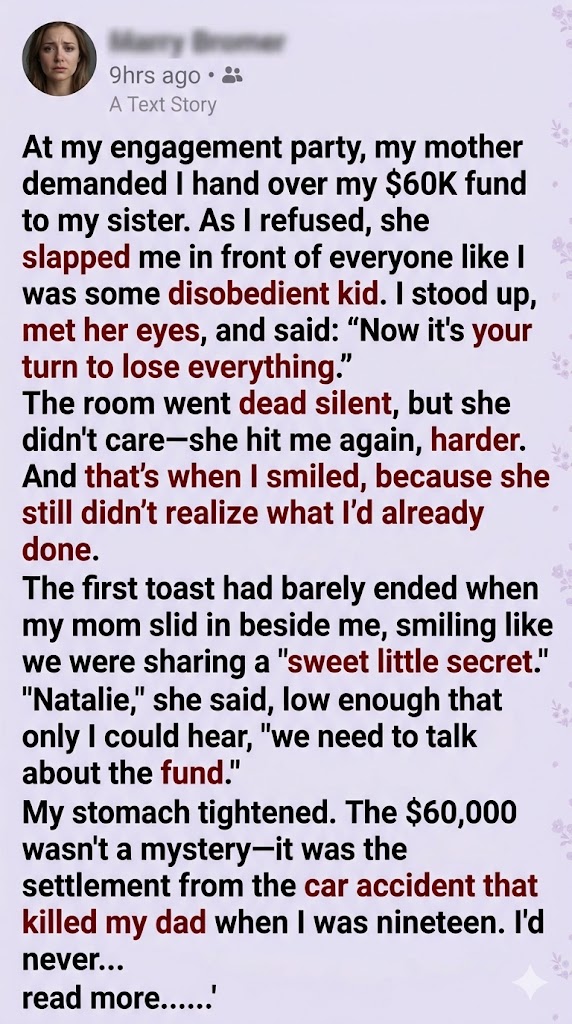 At my engagement party, my mother cornered me and demanded I hand over my $60,000 fund to my sister. When I refused, she slapped me in front of everyone like I was a misbehaving child. I stood tall, looked her straight in the eye, and said, “Now it’s your turn to lose everything.” The room fell silent—but she didn’t hesitate. She struck me again, harder. And that’s when I smiled, because she still had no idea what I’d already put in motion.