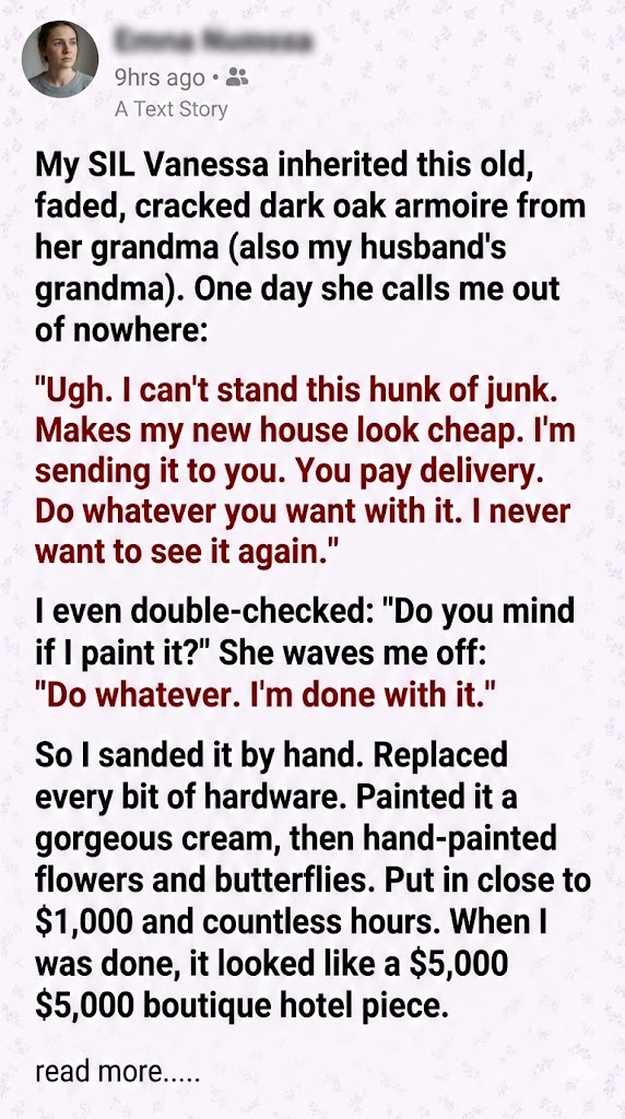 When Vanessa, my sister-in-law, called me out of the blue, I was elbow-deep in dinner prep and paint. Her voice was sharp, impatient. “I need this ugly junk out of my house. Today.” That “junk” was Grandma Rose’s armoire—a piece of family history she dismissed as clutter. She insisted I pay for the movers and do whatever I wanted with it. “Burn it for all I care,” she said.