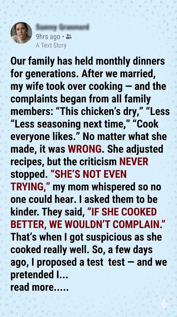 For years, monthly family dinners were a cherished tradition—warm, nostalgic, and full of laughter. When Brandon’s wife Megan joined the ritual, she poured her heart into cooking, eager to contribute. But instead of appreciation, she was met with relentless criticism. “Too bland,” “too dry,” “not what we’re used to,” his relatives would say, chipping away at her confidence.