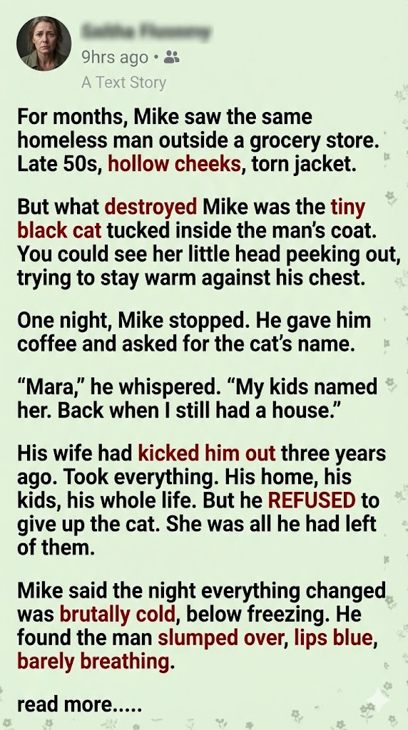 A man, Mike, walked past, but then, for some reason, he turned around. He bought a hot coffee and walked back, ignoring the rules of the invisible world. He simply asked, “Hey. Does she have a name?” I managed to rasp, my voice cracking, “Mara. My kids named her. Long time ago.” That single line—the mention of my children—it cracked something wide open inside me. Mike didn’t plan to get involved, but after that first night, he started showing up on purpose. He brought me sandwiches, gloves, and once, tuna just for Mara. I told him he didn’t have to do it, but he always replied, “I know. But I want to.”