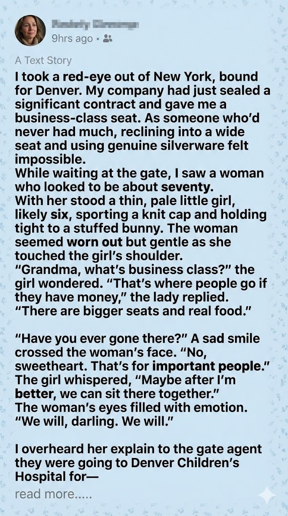 Then, I heard her mention to a flight attendant that they were headed to Denver Children’s Hospital for the girl’s treatment. Something twisted hard in my chest. When I boarded, I saw them in the very last row of economy, right beside the bathroom. The little girl was smiling bravely, but her grandmother looked pale and anxious.