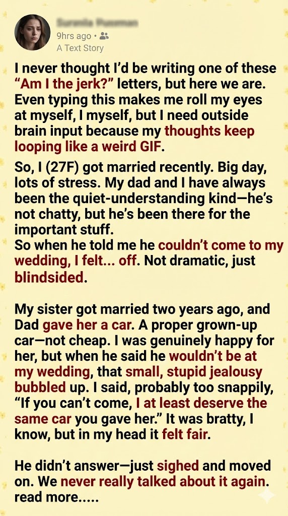 My dad and I have always shared a quiet, steady understanding. He isn’t a man of many words, but he has always been there for the milestones. So, when he told me he simply could not attend my wedding, I felt completely blindsided. It wasn’t just disappointment; it was a sting that felt personal. My sister had gotten married two years ago, and for her big day, Dad had gifted her a car—a proper, expensive, grown-up car. I was happy for her at the time, but the moment he said he wouldn’t be at my ceremony, a small, irrational spark of jealousy flared up inside me.