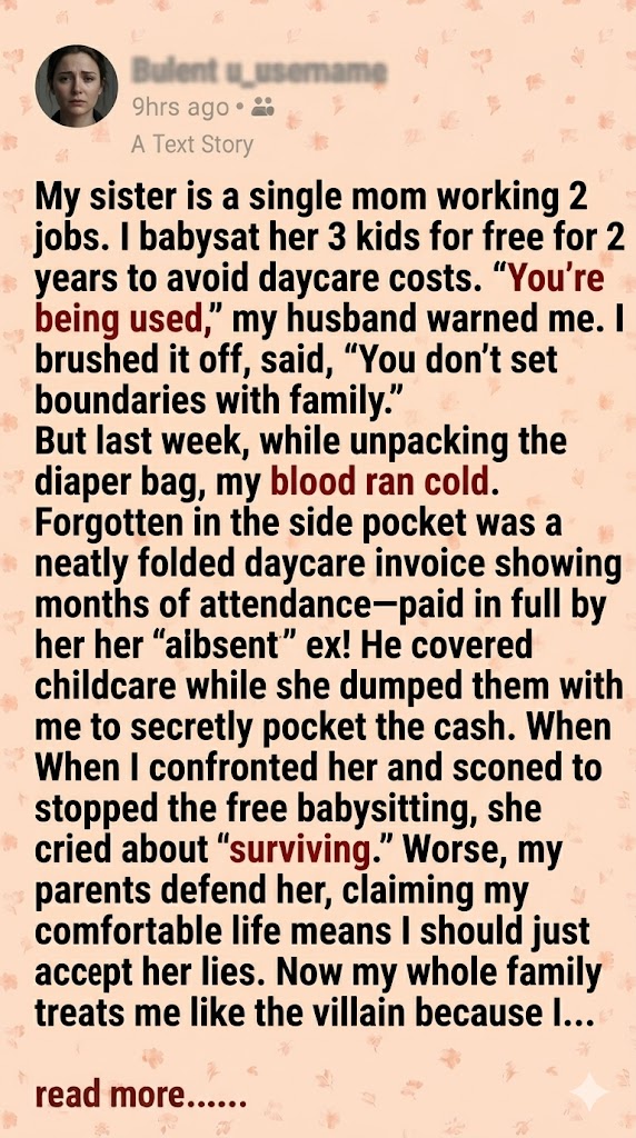 My sister (30) is a single mom working 2 jobs. I babysat her 3 kids for free for 2 years to avoid daycare costs. “You’re being used,” my husband warned me. I brushed it off, saying, “You don’t set boundaries with family.”