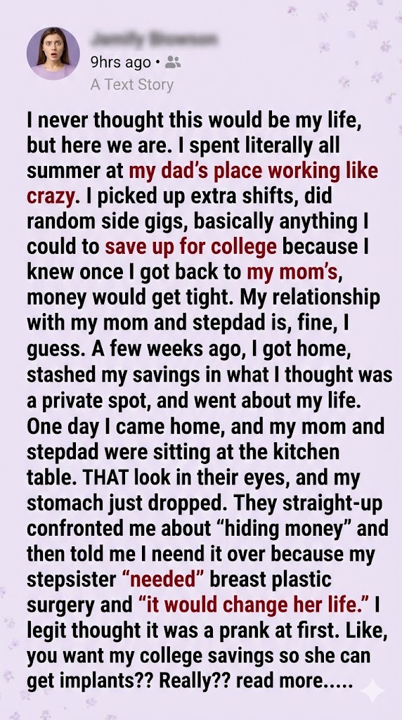 One day I came home, and my mom and stepdad were sitting at the kitchen table. They had THAT look in their eyes, and my stomach just dropped. They straight-up confronted me about “hiding money” and then told me I needed to hand it over because my stepsister “needed” breast plastic surgery and “it would change her life.”