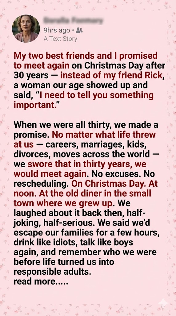 At 24 minutes past noon, the bell above the door rang. I looked up, expecting to see Rick’s familiar slouch and that apologetic grin. Instead, a woman stepped inside. She looked about our age, dressed in a dark blue coat. She paused, scanning the diner with uncertainty. When her eyes landed on our booth, her expression changed. It wasn’t relief or recognition; it was something heavier, like she had rehearsed this moment but still wasn’t ready.