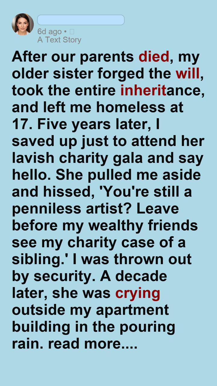 “She stole my inheritance to build a life of luxury, but forgot that a true artist can build an empire from nothing but a blank canvas.”