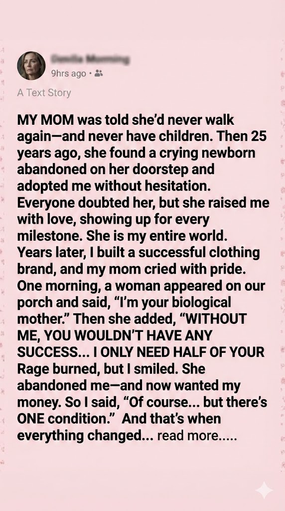 “Sweetheart, you do realize that without me, you wouldn’t have any success, right?” she said. “I’m the one who made sure you were raised by this woman so you’d turn out well. I only need half of your business. That’s fair.”