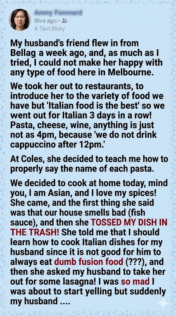We decided to cook at home today, mind you, I am Asian, and I love my spices! She came, and the first thing she said was that our house smells bad (fish sauce), and then she TOSSED MY DISH IN THE TRASH! She told me that I should learn how to cook Italian dishes for my husband since it is not good for him to always eat dumb fusion food (???), and then she asked my husband to take her out for some lasagna! I was so mad I was about to start yelling but suddenly my husband stood up, his chair scraping loudly against the floor.