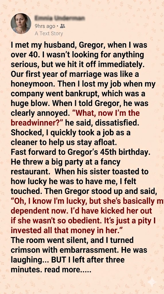 When Abby lost her job, she expected comfort from her husband Gregor, but instead, he turned her into a punchline. At his birthday party, with everyone watching, he raised a glass and sneered, “She’s on my maintenance now. If she’s not obedient, I’ll kick her out.” Laughter followed, but Abby’s heart sank.