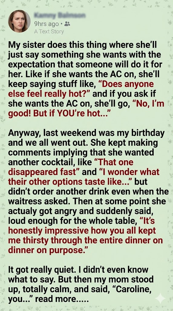 My 25th birthday dinner was meant to be joyful, but my sister Caroline turned it into a spectacle. She has a habit of hinting at what she wants without ever saying it outright—expecting others to read her mind. That night, she kept glancing at the bar, sighing dramatically, and commenting on how refreshing the drinks looked. When the waitress asked if she wanted anything, she declined. Yet moments later, she accused us of being selfish for not ordering her a drink.