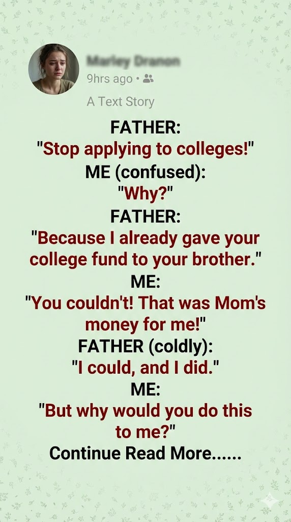 He turned to me, his face completely void of emotion. “Because I already gave your college fund to your brother.”