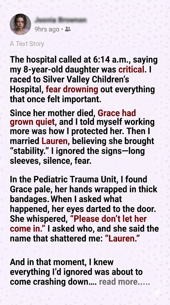 I did not notice when Grace stopped asking me to read to her at night, and I did not question why she flinched at sudden movements, because grief, I thought, explained everything, and the truth required a level of attention I was unwilling to give.