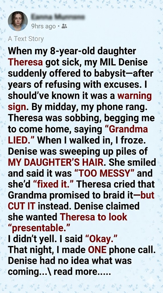 When my mother-in-law offered to help for once, I should’ve known there was a catch. One lie. One pair of scissors. And suddenly, my daughter’s trust — and her hair — were gone. I didn’t scream. I didn’t beg. I made one phone call. And the next day, she woke up ruined.