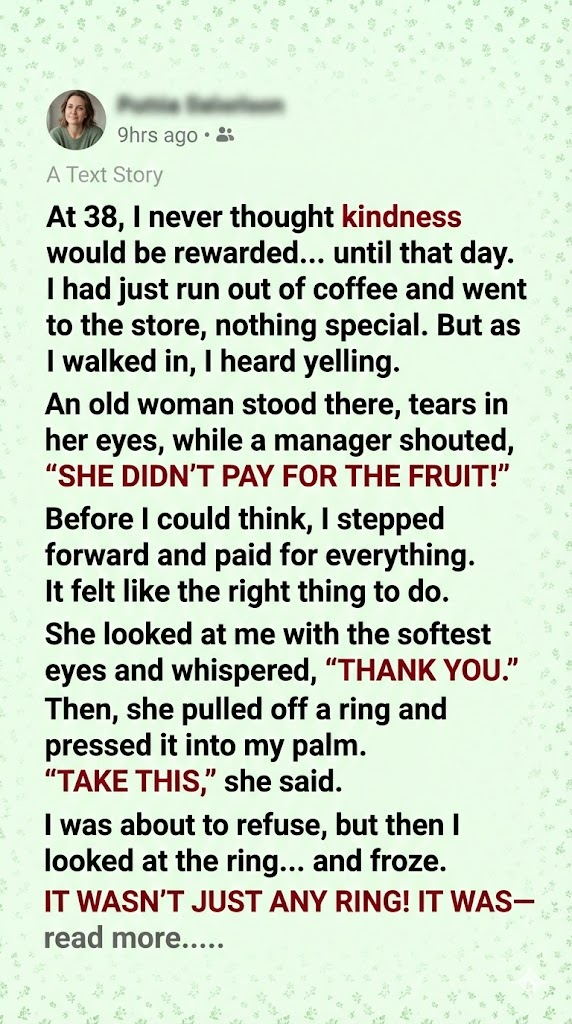 I only went to the store because I’d run out of coffee. I didn’t expect to defend a trembling old woman accused of theft—or to walk out with a ring that stirred memories I thought I’d buried. The moment I saw it, I knew: this story wasn’t ending. It was just beginning.