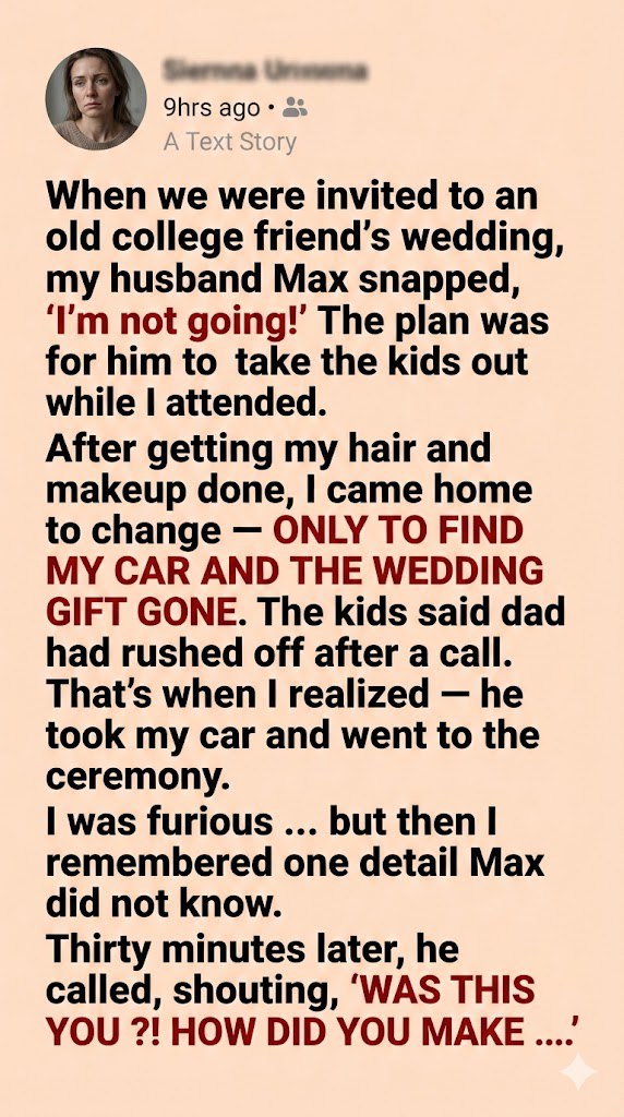 After getting my hair and makeup done, I came home to change — ONLY TO FIND MY CAR AND THE WEDDING GIFT GONE. The kids said dad had rushed off after a call. That’s when I realized — he took my car and went to the ceremony.