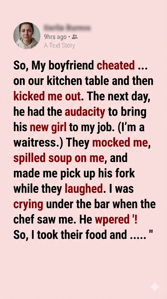 For the next hour, they mocked me. He made a show of holding her hand and kissing her knuckles every time I approached the table. When I brought their appetizers, the girl “accidentally” knocked my hand, causing me to spill soup on me. It burned my arm, but they just gasped theatrically and complained about my clumsiness.