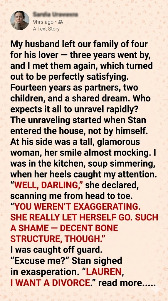 Fourteen years of marriage, two wonderful kids, and a life I thought was solid as stone. Everything I believed in came crashing down one Tuesday evening when Stan brought his mistress into our home.