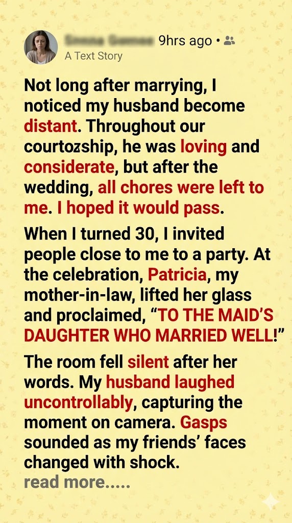 By my 30th, I craved normalcy. Surrounded by friends and my radiant mother, I hoped for peace. Instead, Patricia stood, venomous smile intact: “To Sarah, the maid’s daughter who married well!”