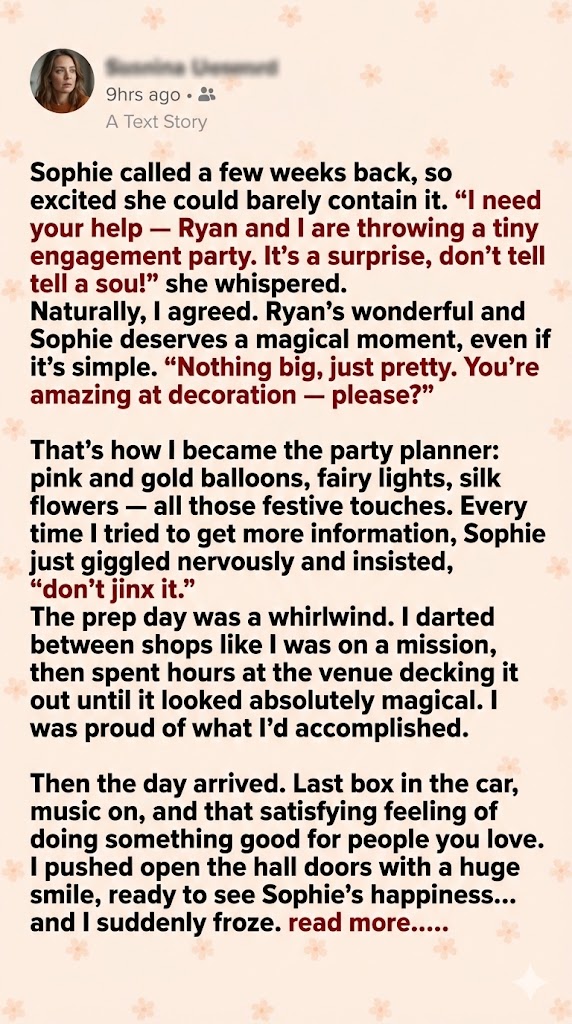 When Saturday arrived, I loaded the last box of heart-shaped balloons into my car, excited for Sophie’s big reveal to Ryan. He had been away for work and was supposed to walk into the surprise engagement. I could already picture his stunned face, the joy in Sophie’s eyes, and the warmth of celebrating.