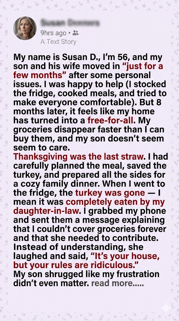 My name is Susan D., I’m 56, and my patience has completely run out. My son and his wife moved in “just for a few months” after some personal issues. I was happy to help. I stocked the fridge, cooked meals, and tried to make everyone comfortable in my home.