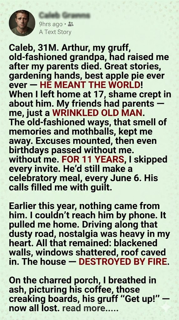 A neighbor recognized me. Said the fire had been fast. Electrical, maybe. Arthur had gotten out—but not before the smoke took something from him. He’d been moved to a care facility two towns over. No phone. No visitors, unless family showed up in person.