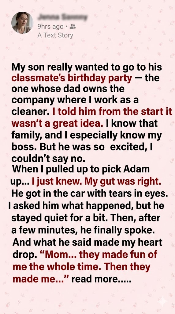 I dropped him off at a mansion that looked like another planet. Hours later, when he slid back into the car, the boy I knew was gone. He was compressed into himself, a wounded animal. The silence was suffocating. Finally, he broke. Through streaming tears, he whispered the truth: “They made fun of me, Mom. They said I was just like you. A cleaner.”