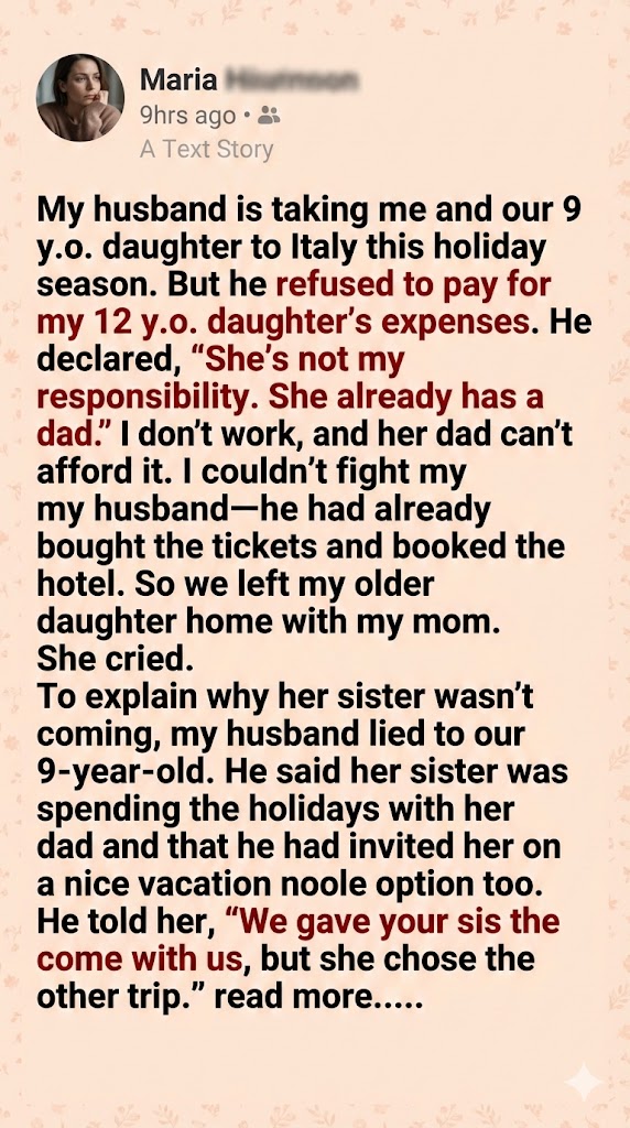 My husband is taking me and our 9 y.o. daughter to Italy this holiday season. But he refused to pay for my 12 y.o. daughter’s expenses. He declared, “She’s not my responsibility. She already has a dad.”
