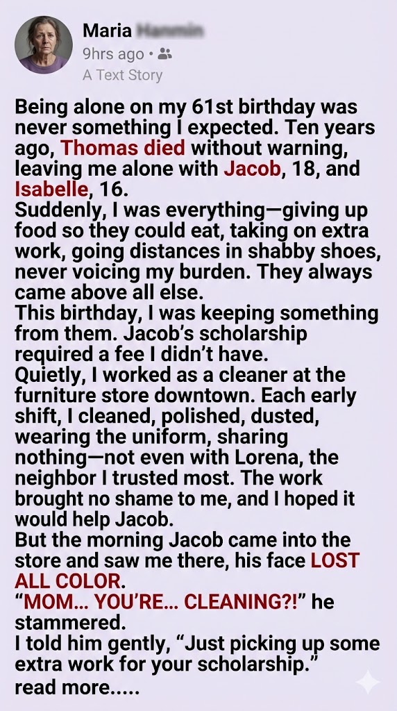 So quietly, without telling absolutely anyone, I got a new job as a cleaner at the furniture store located in our small downtown mall. Every morning at six sharp, before most people were even properly awake, I scrubbed the floors, meticulously dusted the display pieces, polished all the glass tables, and sanitized everything in sight. I wore a simple blue uniform and kept a smile on my face, even when my back ached terribly and my knees protested every single move.