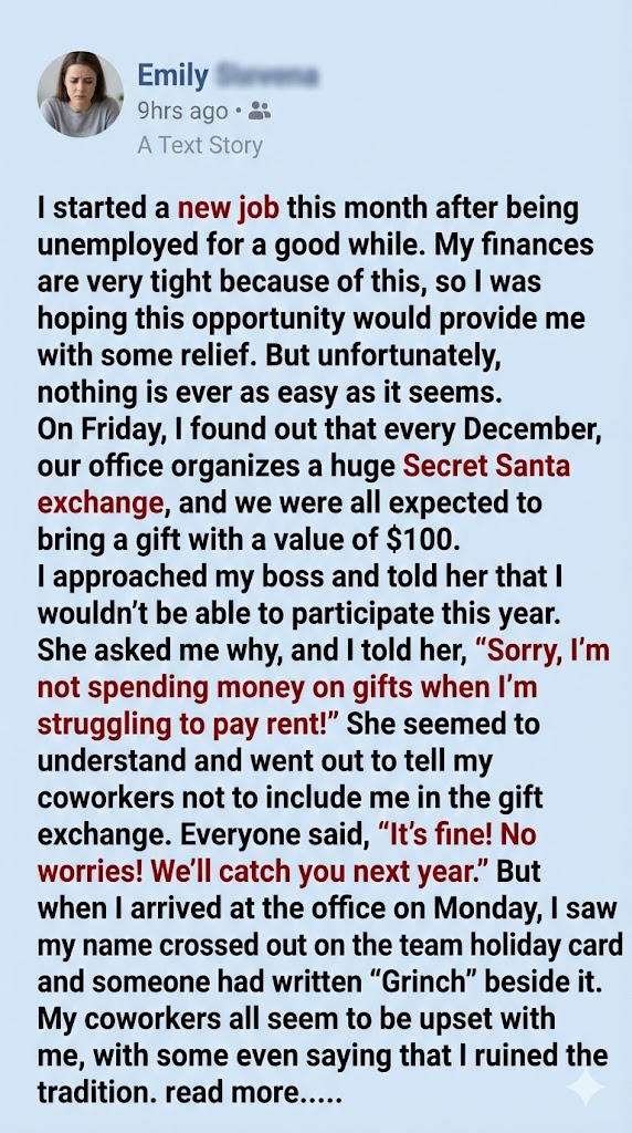But when I arrived at the office on Monday, I saw my name crossed out on the team holiday card and someone had written ‘Grinch’ beside it. My coworkers all seem to be upset with me, with some even saying that I ruined the tradition.