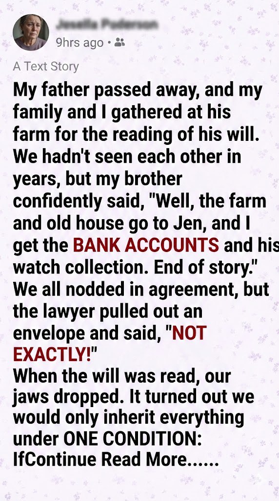 My father passed away, and my family and I gathered at his farm for the reading of his will. We hadn’t seen each other in yearsâmostly because of money disputes and petty argumentsâbut my brother, Mark, walked in looking smug.