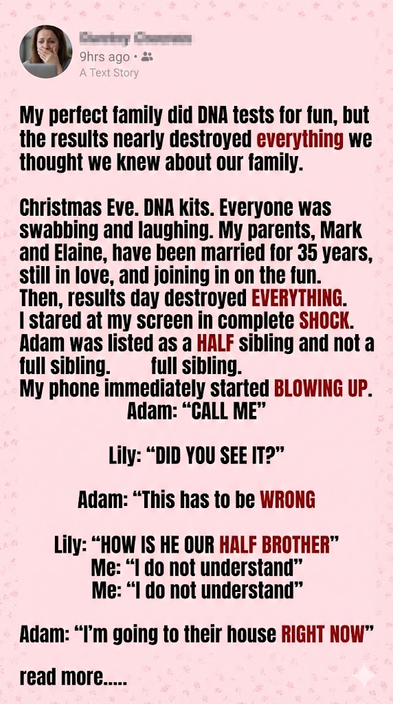 Christmas Eve. DNA kits. Everyone laughing, swabbing, teasing each other about ancestry percentages. My parents, Mark and Elaine, married for thirty-five years, still holding hands like newlyweds, thought it was hilarious.