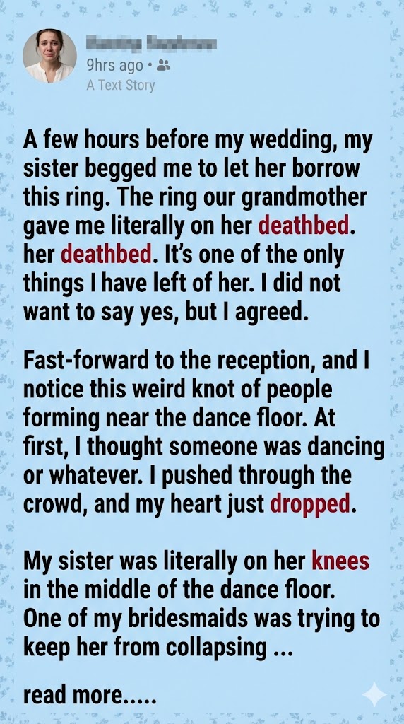 She started sobbing, saying she must’ve taken it off to wash her hands, that it slipped, that someone probably picked it up. I felt numb. That ring wasn’t just jewelry—it was my grandmother’s last gift to me.