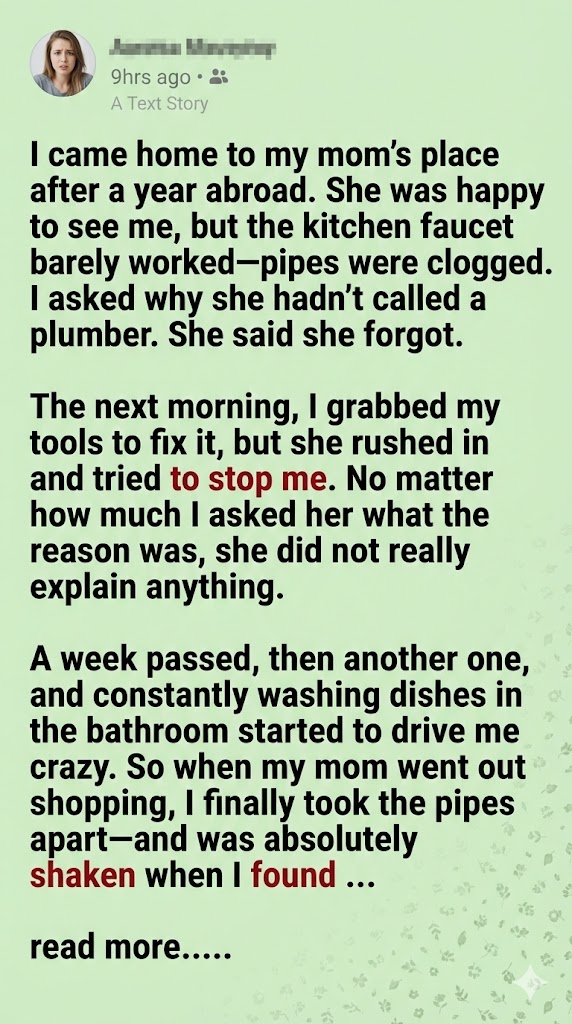 When she came home and saw the pipes disassembled, she broke down. She admitted she’d blocked the sink on purpose to protect the letters. She said the house felt empty without me, and writing to me was the only way she coped.