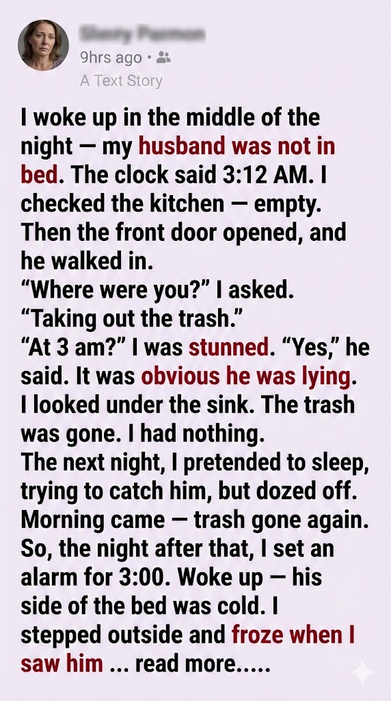 Now, every Tuesday night, we take the trash out together. And every time I hear the door open at 3 a.m., I don’t feel afraid anymore.