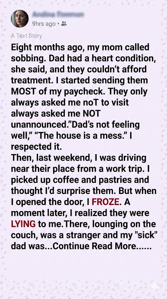 Eight months ago, my mom called sobbing. Dad had a heart condition, she said, and they couldn’t afford treatment. I didn’t ask questions. I didn’t ask for medical records. I just panicked. I started sending them MOST of my paycheck. I moved into a smaller, grimier apartment. I stopped going out with friends. I ate instant noodles for dinner almost every night just to make sure the wire transfer went through on the first of the month.