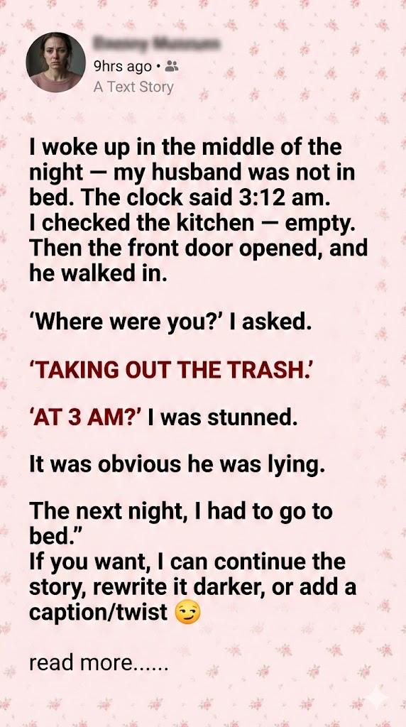 Now, every night at 3:12 a.m., I wake up alone — and the trash still hasn’t gone out.