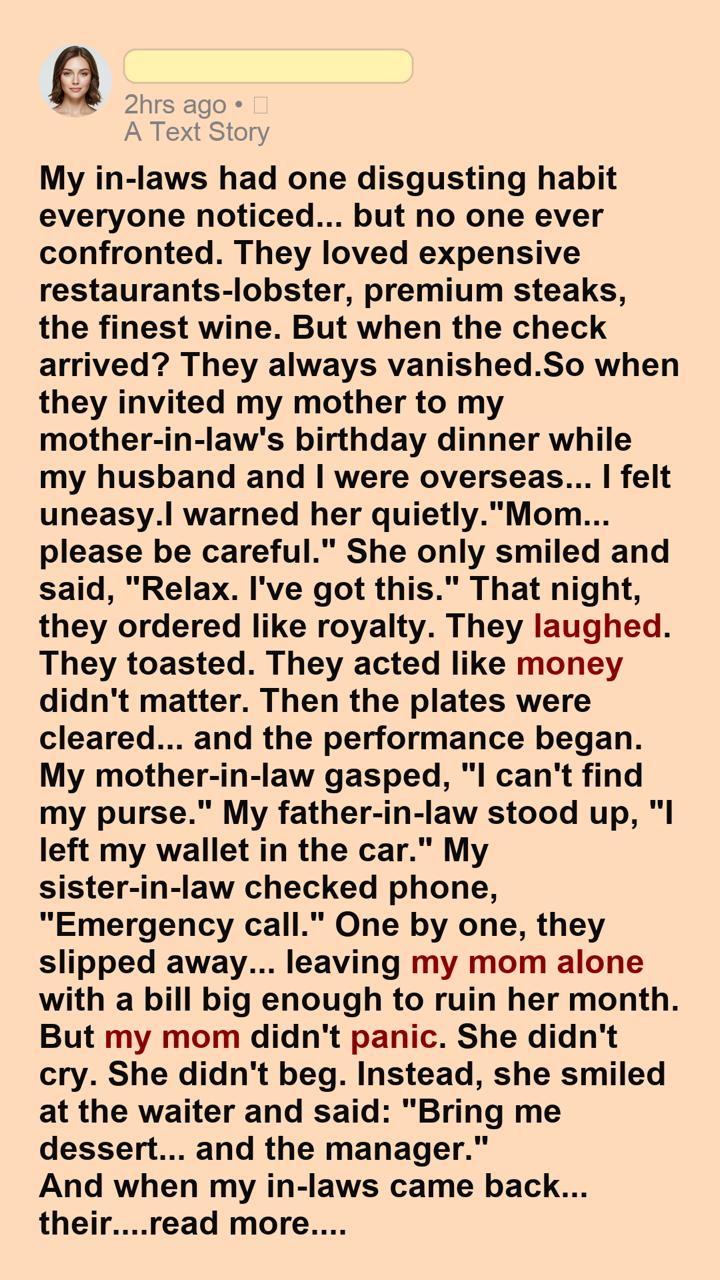 They loved the best restaurants in town. The ones with candlelight tables, wine menus thicker than books, and steaks so expensive you almost felt guilty ordering them.