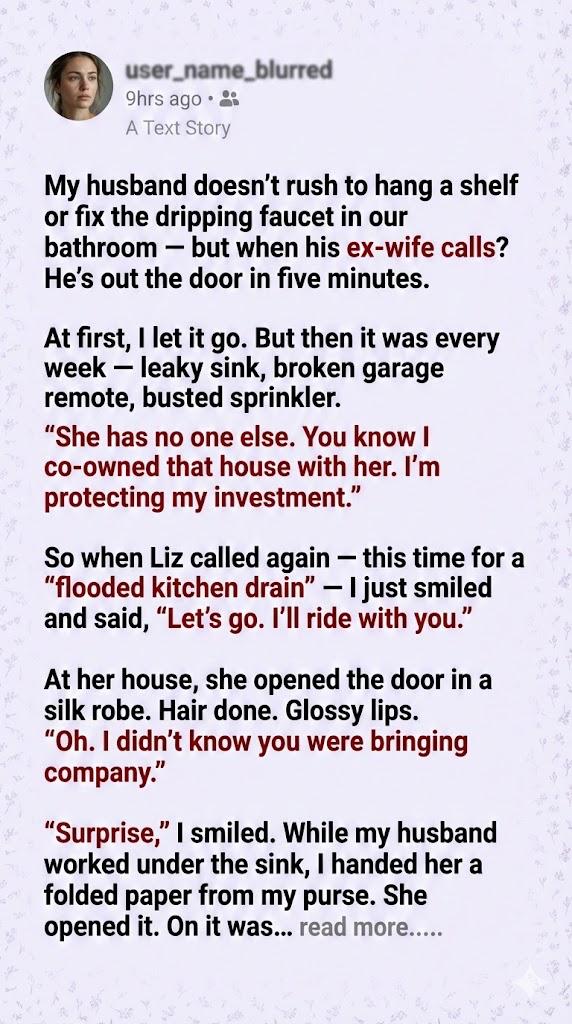 When I finally decided to accompany my husband to his ex-wife’s house, I never expected to find her in a silk robe with perfect hair and glossy lips. But that wasn’t nearly as shocking as the look on her face when she saw me standing beside him.