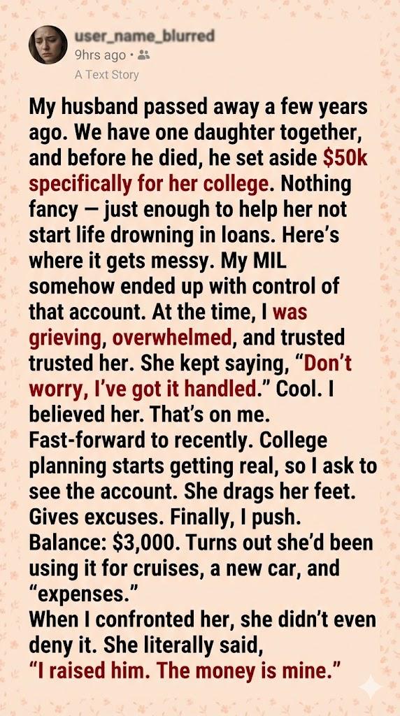 The fallout was immediate. My daughter, devastated, refused to speak to her grandmother. She felt betrayed, robbed of the security she’d been promised. I demanded accountability, but my MIL offered excuses instead of remorse. She insisted she’d “pay it back eventually,” though we knew she couldn’t.