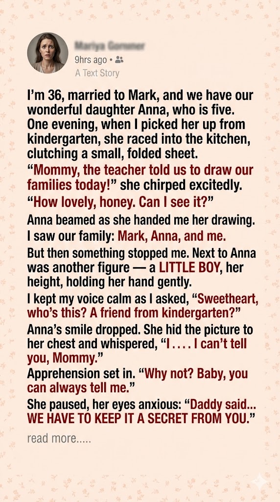 There it was: a cheerful drawing. Me, smiling. Mark, tall and waving. Anna, right in the middle. But then, my heart stumbled. Next to Anna was another figure. A boy. Drawn the same size as her, holding her hand like he belonged there. Something was very, very wrong.