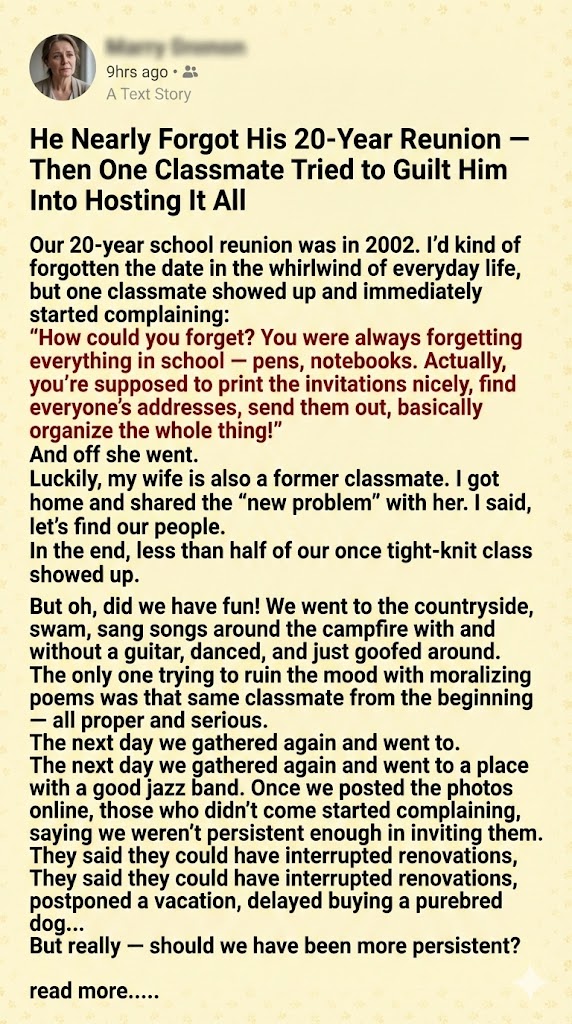 Thankfully, his wife—also a former classmate—was more amused than annoyed. When he got home and shared the drama, she simply said, “Let’s find our people.” They reached out to old friends, and though less than half of their once-close class showed up, it didn’t matter. The ones who came brought all the warmth they needed.