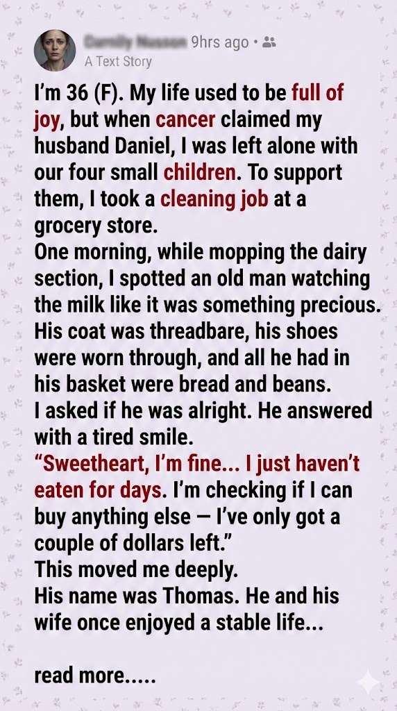 It was just another ordinary shift at the grocery store, the kind where your feet ache, your hands are sticky, and every aisle feels like a tiny battlefield. I was pushing my mop down the dairy aisle when I noticed an old man standing there, staring at the milk as if it held all the secrets of the universe. I had no idea that this simple, quiet moment would change the course of my life—and the lives of my children—forever.